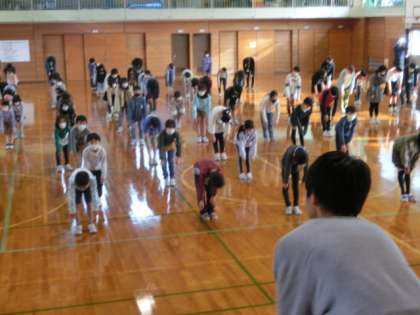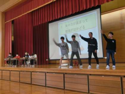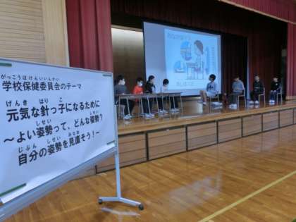 11月24日(木) 学校保健委員会1 公開日 2022/11/24 更新日 2022/11/24 学校の様子 今日5時間目は、全校集会で学校保健委員会を行いました。健康委員会が「元気な針っ子になるために、自分の姿勢を見直そう」というテーマで発表をしました。その後、よい姿勢になるためのストレッチ体験をしました。★ミニ動画→健康委員会発表1、姿勢をよくするストレッチ1