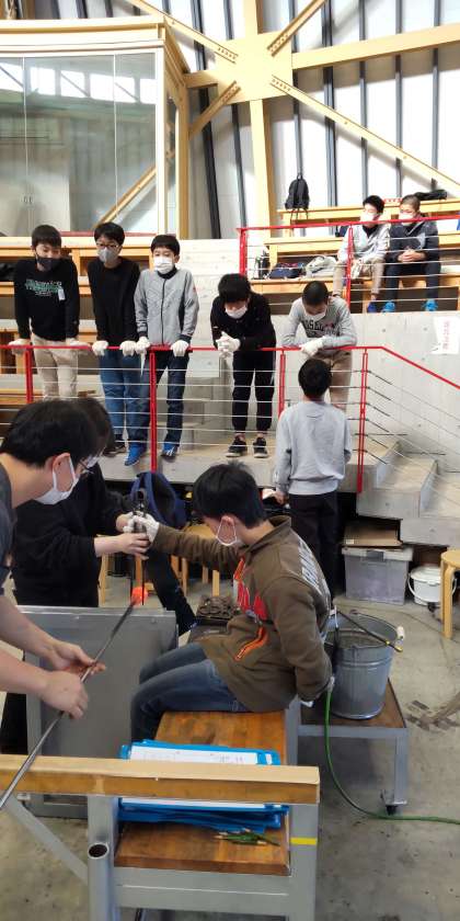 いよいよ工房で、ガラスの元を火で熱し、膨らませ、色をつけます。