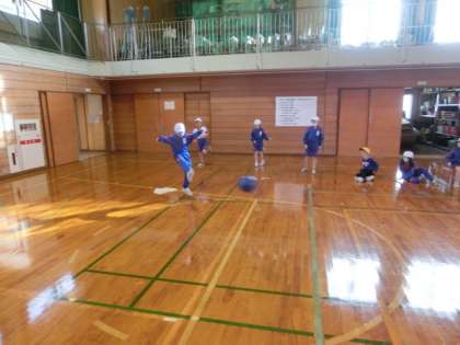 2年生が体育で、キックベースボールを行いました。今までボールをけったり捕ったりする練習してきた成果を発揮しています。
