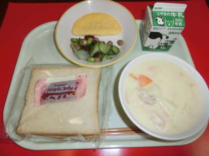 「食パン、オムレツ、クリーム煮、ミックスビーンズのマリネ、メープルジャム」でした。