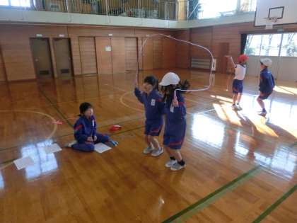 2年生が、体育のなわとび遊びで、横や向かい合って、または同じ向きを向いて、2人や3人で跳ぶ練習をしています。ミニ動画→