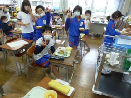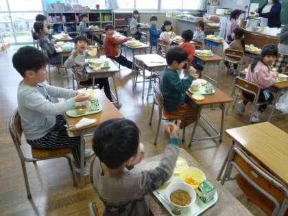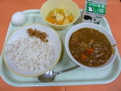 今日の献立は「カレーライス(麦ごはん)、福神漬け、ゆで卵、フルーツゼリーミックス」でした。どのクラスも、お代わりする子がたくさんいました。