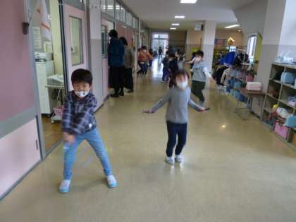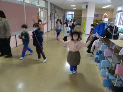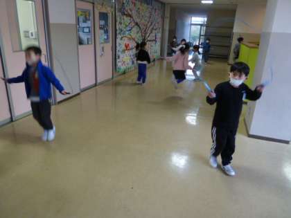 休み時間、廊下でなわとび練習をする1年生。現在、全校でなわとびに取り組む子供が多いです。まさに、うさぎのように跳びはねる針っ子たちです。