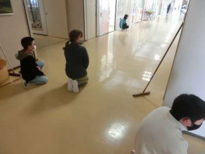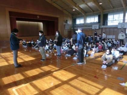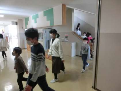 縦割り班の清掃中に「近所の民家から出火」という想定で、避難訓練を行いました。今までは学級ごとに行っていましたが、今日は5・6年班長の指示で、静かに班ごとに体育館に移動・集合することができました。