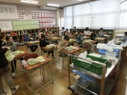 今週は「学校給食週間」です。テーマは「本の世界を味わおう」。今日は、男子弁当部の主人公が大きな鍋で作った「のっぺい汁」でした。給食委員会児童が紹介しています。