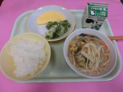 昨日の献立は「ごはん、ラーメン、オムレツ、フレンチサラダ」でした。今週は給食週間で、本にちなんだ献立になっており、昨日はお話料理教室のメニューでした。また、2年生が、放送で調理員さんへの感謝の手紙を読みました。