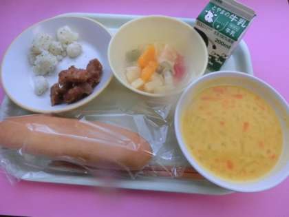 今週は給食週間で、いろいろな本を表す献立でした。今日はの献立は「シンデレラ」にちなんだ「かぼちゃのポタージュ、豚肉のハニーマスタードソースがけ、グリーンポテト、ガラス靴のフルーツカクテル」でした。