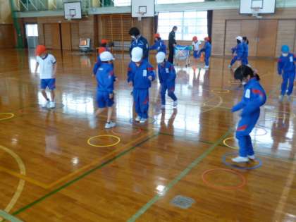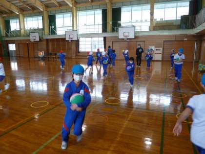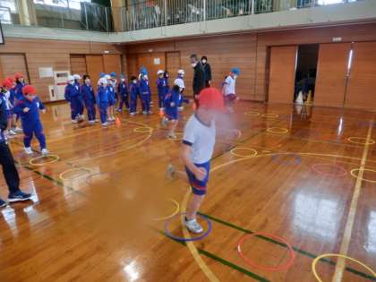 市体育協会の指導員に、コーディネーション教室をしていただきました。2年生は、フラフープを片足や両足で跳んだり、ボールを運んで走ったりしました。★ミニ動画→