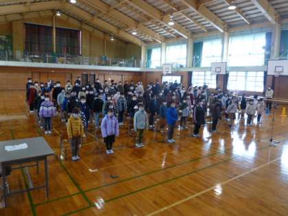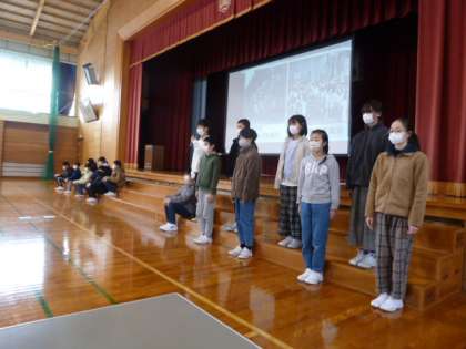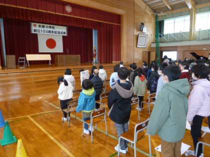 明日のリハーサルを行いました。3年ぶりに全校で君が代や校歌を歌ったり、6年生が「針原小学校150年今昔物語」を発表したりしました。
