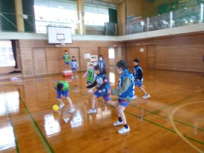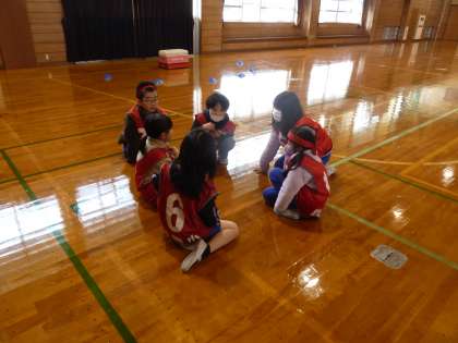 3年生も、ポートボールの試合をしています。チームで作戦を話し合ったり、全員が動いてパスをつなげてシュートをねらったりしています。
