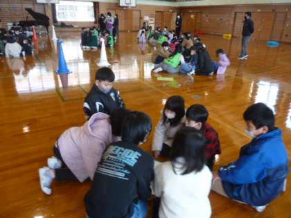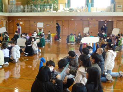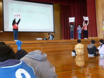 司会が出したお題について、なかよし班で答えを書きます。「赤い果物といえば」「6年生が好きな給食は」など、各班で相談し当てて盛り上がりました。★ミニ動画クリック→