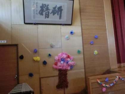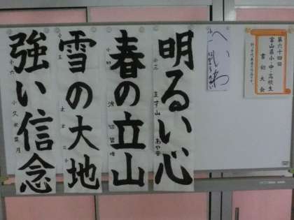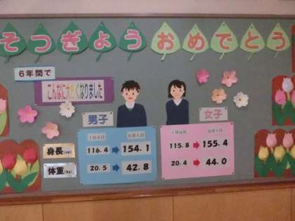 校内には、卒業式に向けたお祝い掲示がみられます。県小中高校生書き初め大会に参加した子供たちの作品、保健室前に6年生の体の成長具合、体育館の飾り付けなどです。