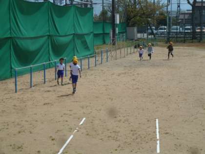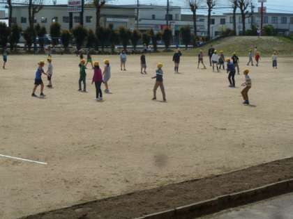 大休憩(2〜3時間目の間の休み時間)、多くの子供がグラウンドで遊んでいます。ドッジボールや鬼ごっこ、鉄棒や遊具で遊ぶ子もいます。