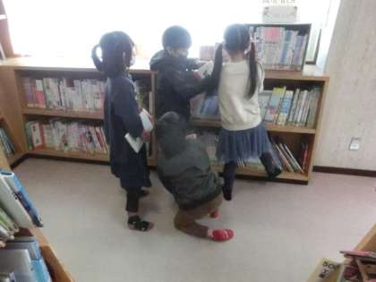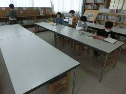 2年生が、図書館で本を2冊借りています。今年度は、多くの本に親しむことで、心や想像力を豊かにしたり、学力の基礎になる知識・教養を高めたりしてほしいと願います。