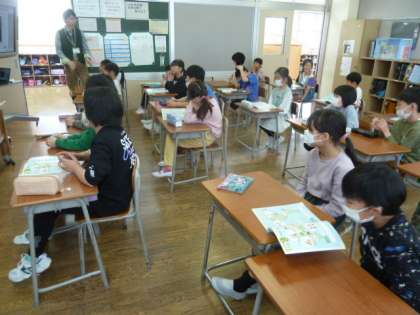 4年生が今年度初めての外国語活動の授業です。英語専科の先生は、オーストリアの服を着ていました。ALTの先生も英語で話します。