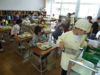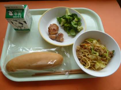 今日の給食は「コッペパン、焼きそば、照り焼きチキン、えごまドレッシングサラダ」でした。