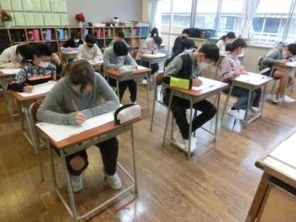6年生が、国語と算数の全国学力・学習状況調査にのぞみました。昨年度から練習はしていましたが、本番のテストで真剣に読んで考え、懸命に書いています。