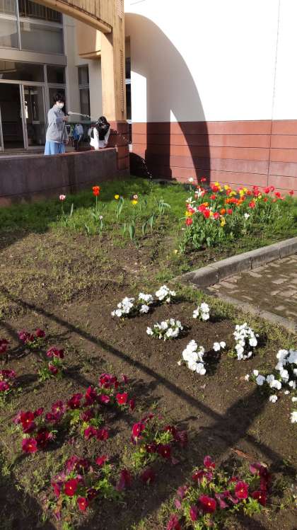 環境委員会児童が、花壇の花に水やりをしています。今日は、暑くなりそうです。毎日、水筒(飲料水)を持たせてください。