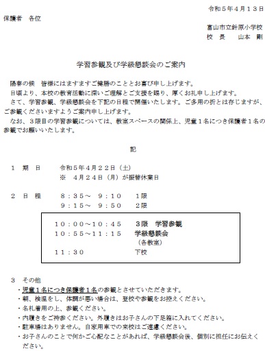 4月22日(土)学習参観の案内