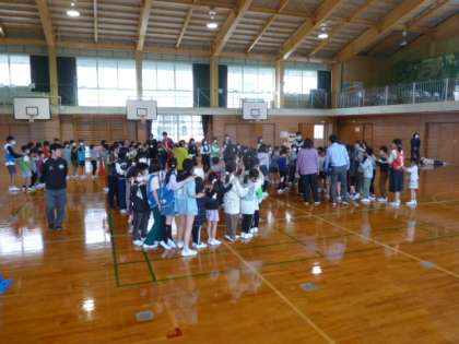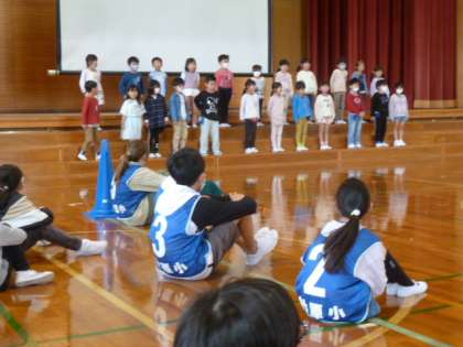 ジャンケン列車で全校児童つながりました。ジャンケンチャンピオンは5年女子。最後に、1年生が校歌を披露しました。「これで1年生も針っ子の仲間入りだね。計画・準備をした6年生、ありがとう」ミニ動画クリック→