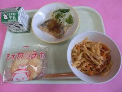 今週は5月12日から富山市・金沢市で始まるG7教育大臣会合に参加する国の料理を取り入れた「サミット給食」です。今日は「ひき肉とトマトのスパゲッティー、ホキのイタリアンソースかけ、フォカッチャ、アスパラサラダ」でした。