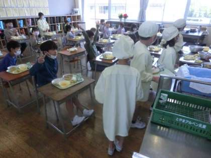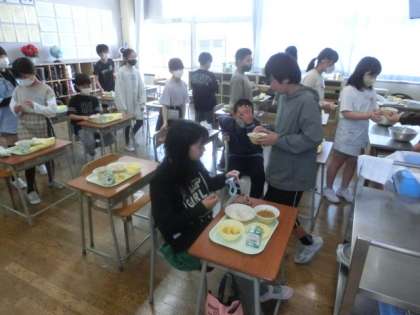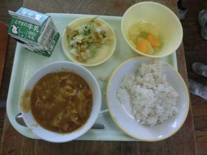今日の給食は「麦ごはんカレーライス、福神あえ、フルーツゼリーミックス」でした。どのクラスもお代わり続出です。
