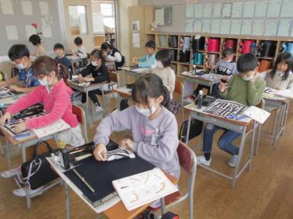 書写では毛筆を使って書く学習をしました。点画の種類を確認して、集中して練習しました。