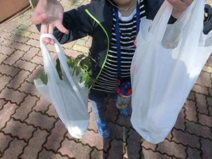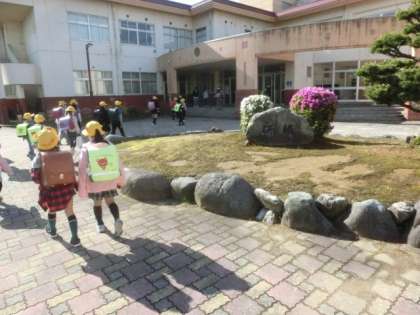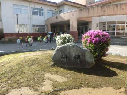 気持ちよく晴れた朝、赤や白のツツジの花が咲く「研精」碑の横を登校してきました。明日植える野菜の苗や図工の材料など手一杯に持ってきた子供もいます。