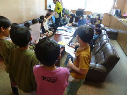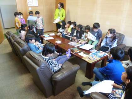 2年生が生活科で、1年生に校舎内のいろいろな教室を案内します。今日は校長室などでリハーサルをしました。「どうしてソファーがあるのでしょう」クイズにして1年生に紹介します。