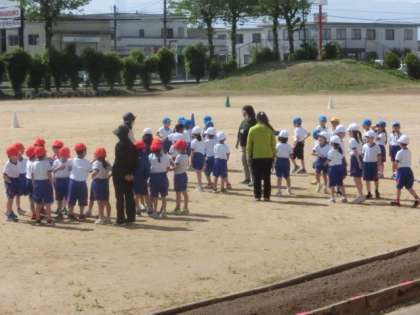 1・2年生が折り返しリレーの練習を始めました。1回終了後、2年生中心に走順がこれでいいか相談しています。