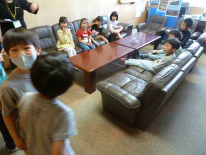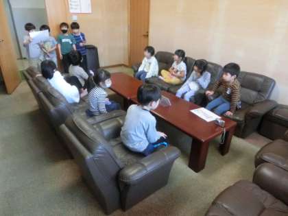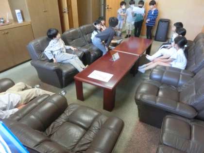 2年生が、1年生に学校のいろいろな教室や場所を案内しています。校長室では、1年生がソファーに座って2年生が説明しています。