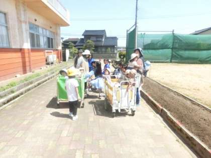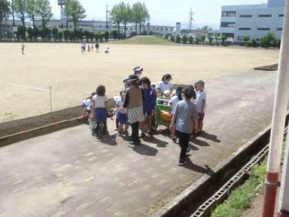 保育園児も運動会の練習の様子を見学に来ていました。かわいらしいお客さんや懐かしい園の先生を、小学生が出迎えています。