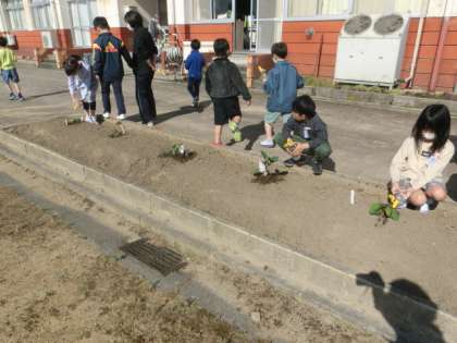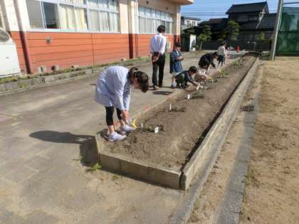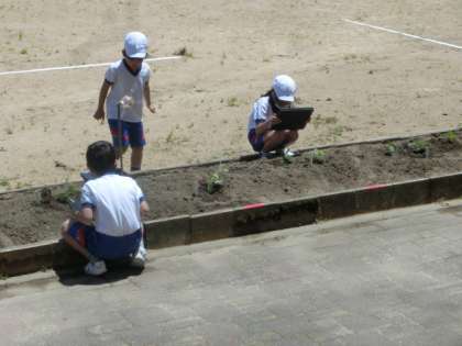 2年生が昨日植えた野菜の苗に水をやっています。タブレットで撮影している子供もいます。