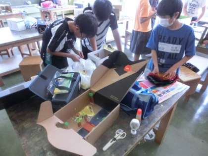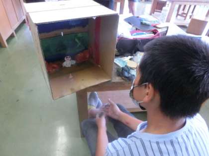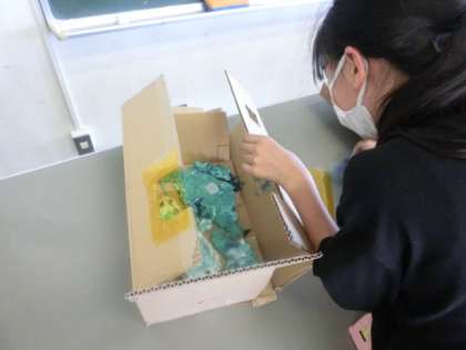 5年生が図画工作科で「のぞいてみると」という作品づくりに取り組んでいます。段ボールの箱の中に、自分で想像した材料や絵を組み合わせています。穴を空けて光を取り入れながら。