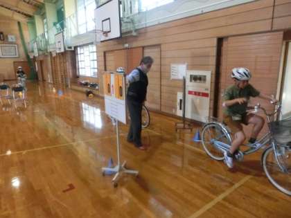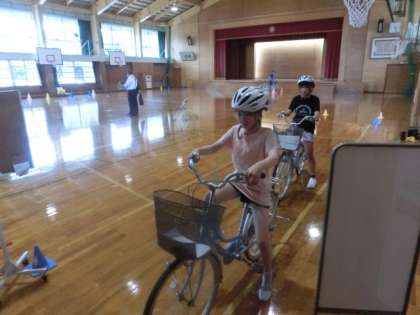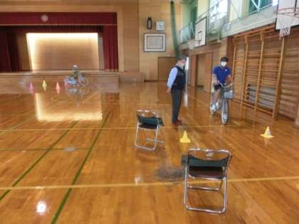 5・6年生4名が参加する自転車大会の練習の様子です。体育館で、道路や横断歩道、線路を想定した練習場をつくっていただき、実際に自転車に乗ってまわりました。