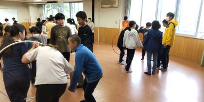 友達との交流を深める「サークルさー来る」班でフラフープくぐり