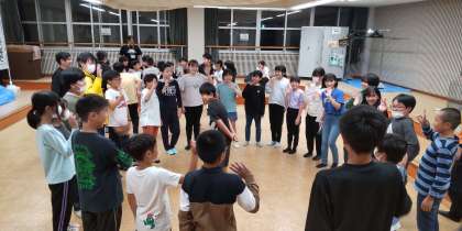 立山の夜、レクリエーションで楽しむ5・6年生。学校ではできない体験です。