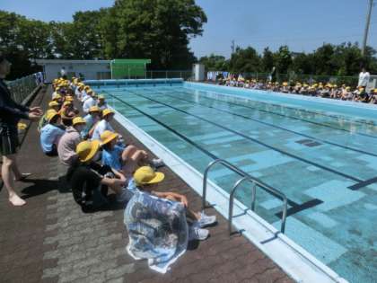 今日は、待ちに待ったプール開き。初めに代表児童による模範遊泳を見た後、1年生と6年生から入りました。ミニ動画→