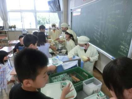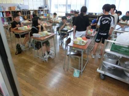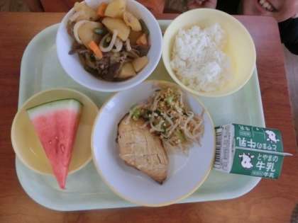 今日の給食は「ごはん、肉じゃが、サバの塩焼き、入り大豆あえ、すいか」でした。すいかが大好きでお代わりする子と、やや苦手な子がいます。