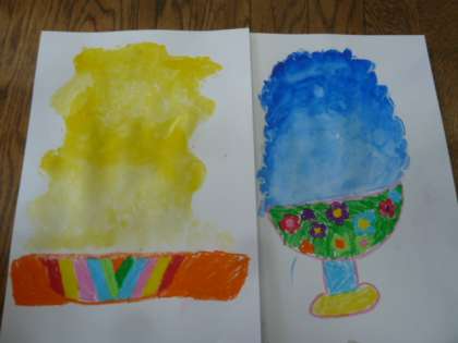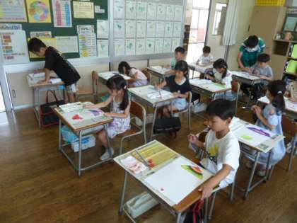 1年生図工では、水彩絵の具で絵を描いています。おいしそうで涼しそうな「かきごおり」を、個別懇談会の際にご覧ください。