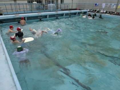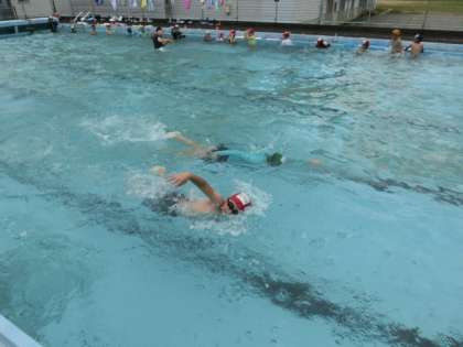 3・4年生が、比較的涼しい1限、プールに入りました。グループに分けて、初心者は壁でバタ足、泳げる子はビート板を使ってストローク練習をしています。ミニ動画→
