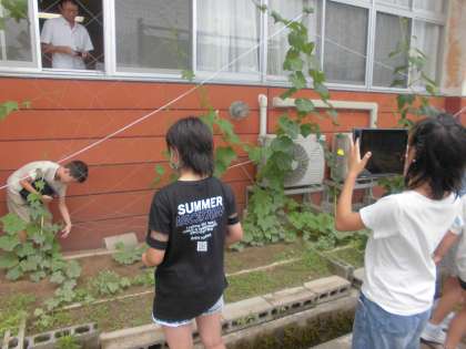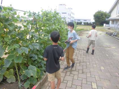 夏の植物の様子を観察しました。春に種を植えたヘチマが成長し、自分たちの身長より高くなりました。ここ数日で茎が大きく伸び、驚く子供たちでした。