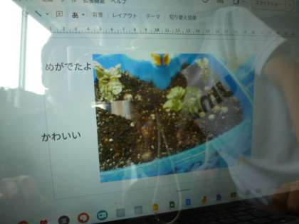 1年生がタブレットを使って生活科の学習をしました。アサガオの写真に感じたことを追加入力しています。