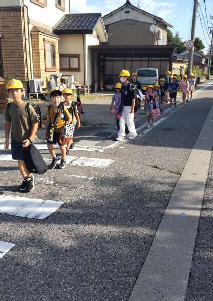 暑い朝、子供たちが元気に登校してきました。手や背中に、夏休みの宿題や作品などを大事そうに持って。