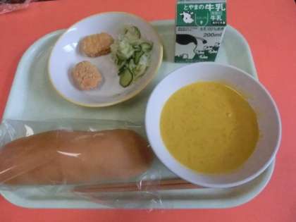 1〜5年生の給食は「コッペパン、チキンナゲット、かぼちゃポタージュスープ、えごまドレッシングサラダ」でした。6年生は、チャレンジ陸上記録会が延期になったため、今日は弁当でした。※6年生は来週も、記録会実施でも中止でも弁当です。