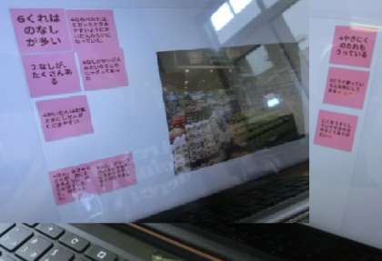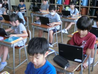 3年生が社会で、先日見学に行ったスーパーマーケット店で売るための工夫を話し合っています。タブレットで考えをまとめたり聞き合ったりしています。