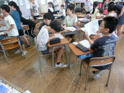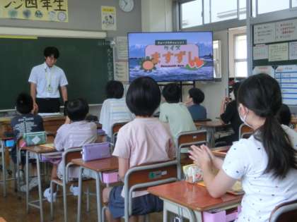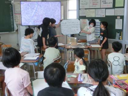 4年生で、教育実習の先生が社会科の授業をしました。子供たちは「なぜ、ます寿司の店が集まっているのか」を考えることで、昔と今の神通川の違いや人々のくらしについて学びました。