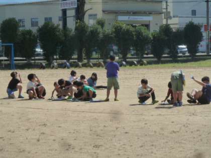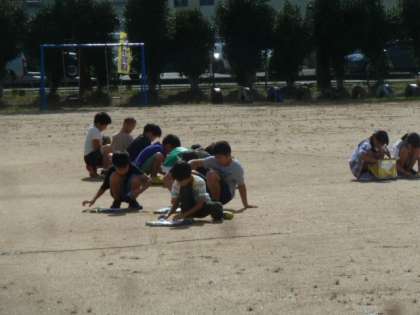 10月になりました。秋晴れの空のもと、3年生が理科で、太陽とかげの学習をしています。上が9時、下が12時の様子。太陽の向きや高さ、かげはどう変わったかな。