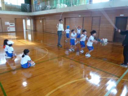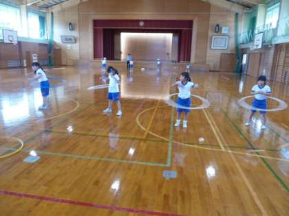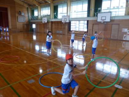 2年生が、学習発表会の練習をグループごとに始めました。なわとび(大なわ)とフラフープの様子です。