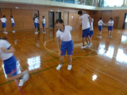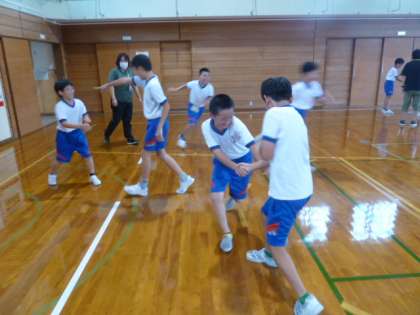 10月4日(水)5・6年 アスリート派遣教室1 公開日 2023/10/04 更新日 2023/10/04 学校の様子 2人組で手をつないで引っ張り合ったり、ジャンケンをして軽く触ったり、グラウンドで追いかける遊びを教えてもらいました。